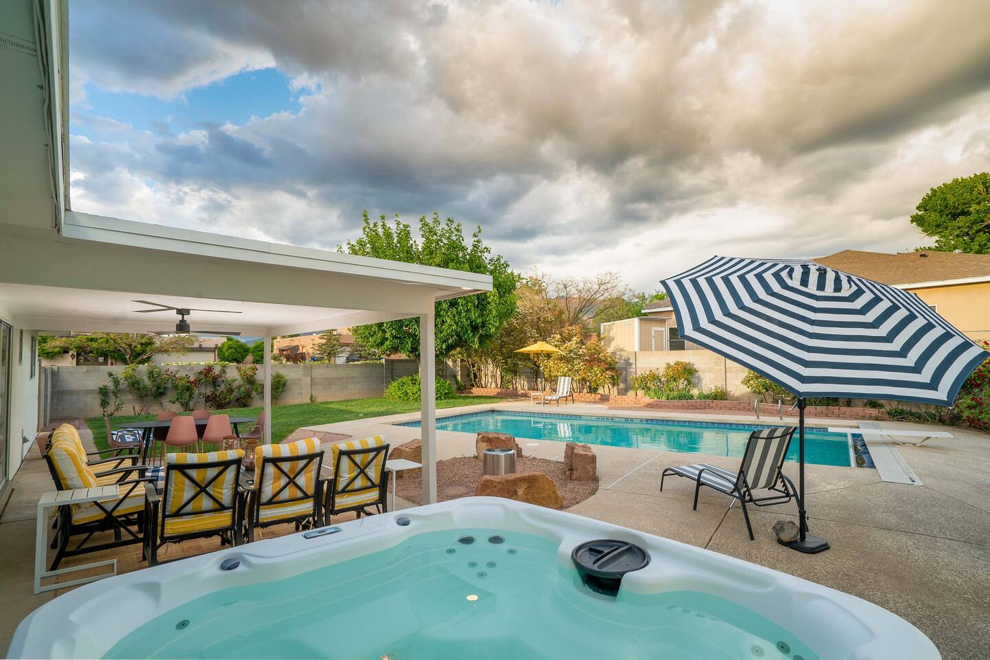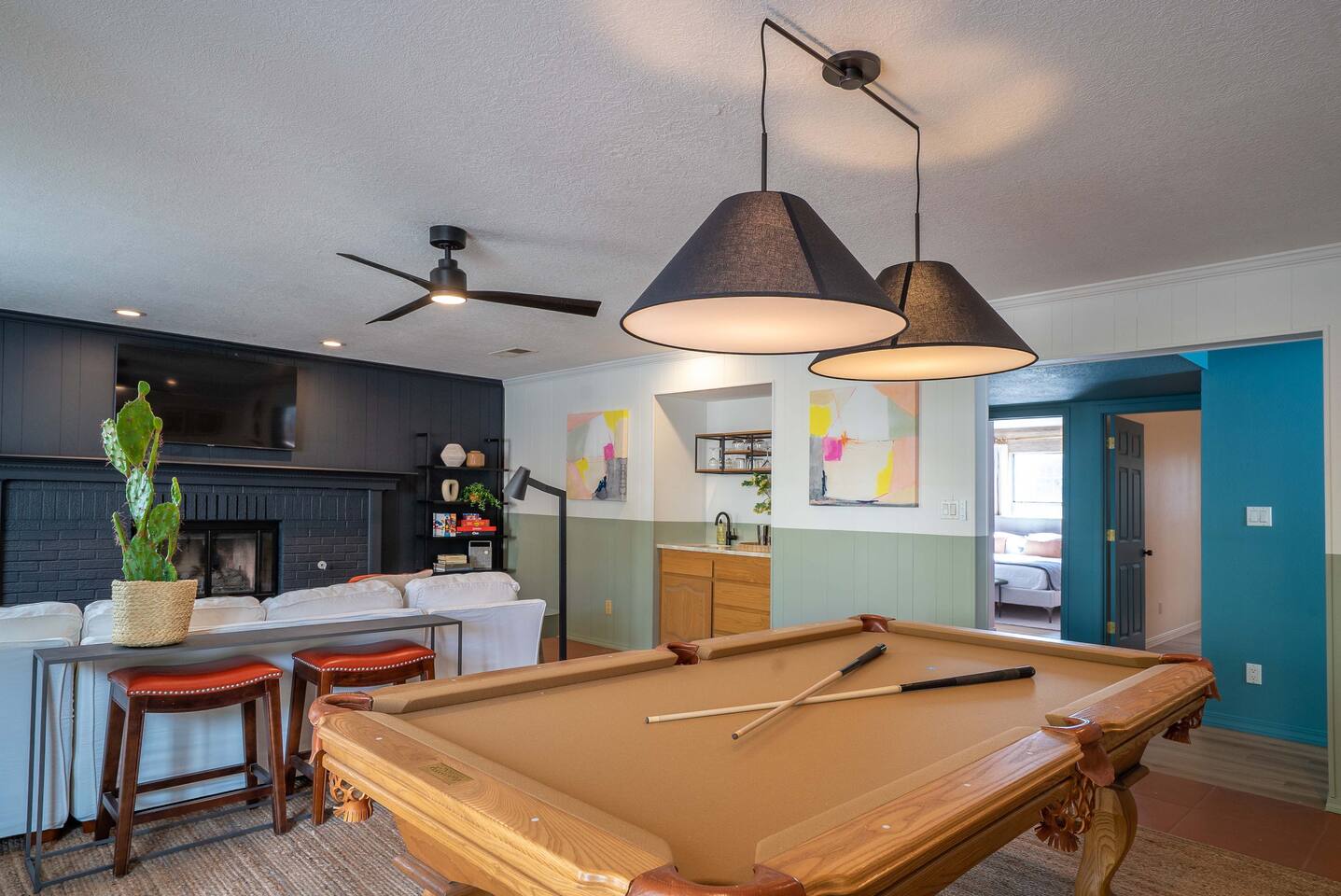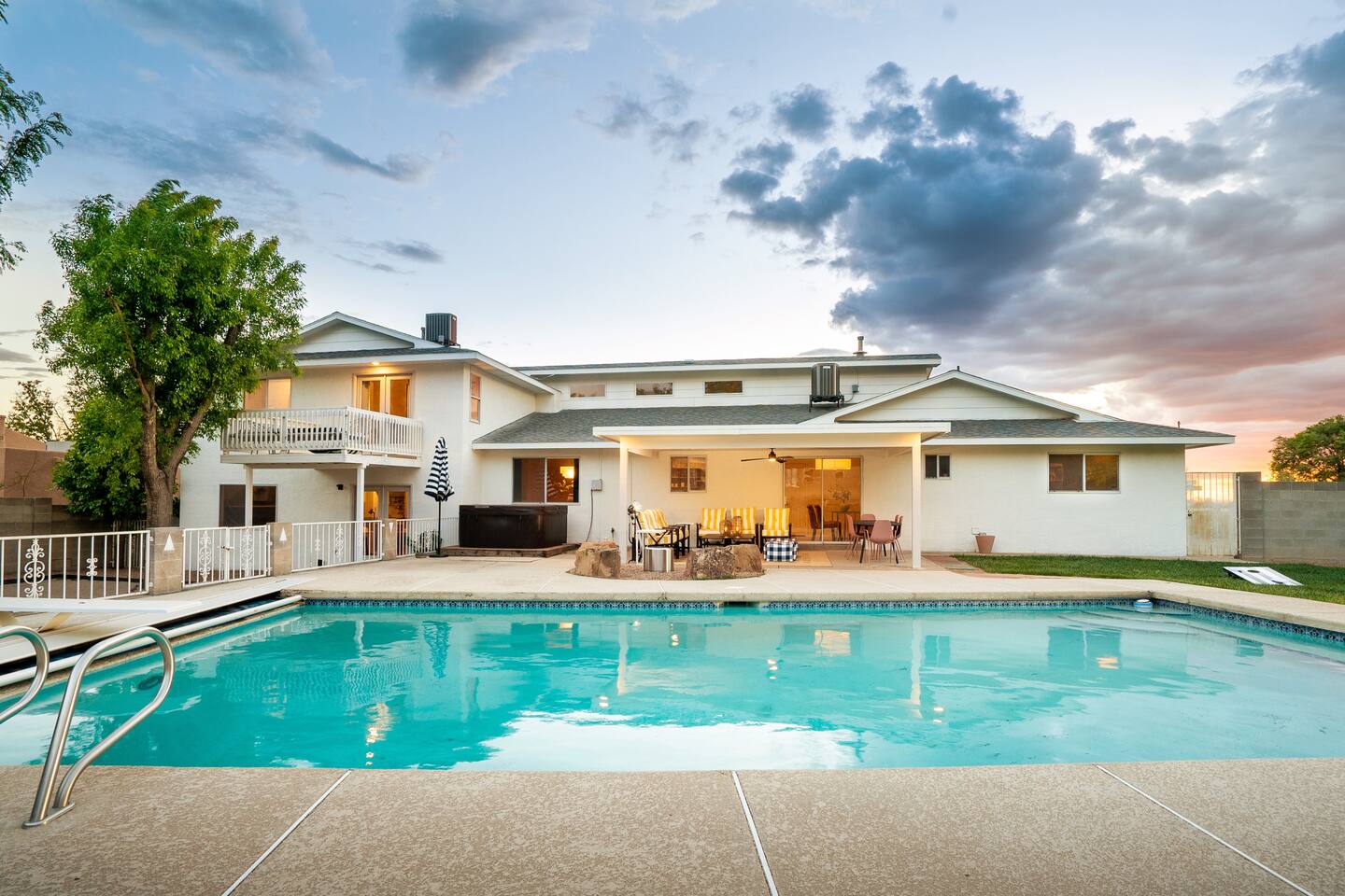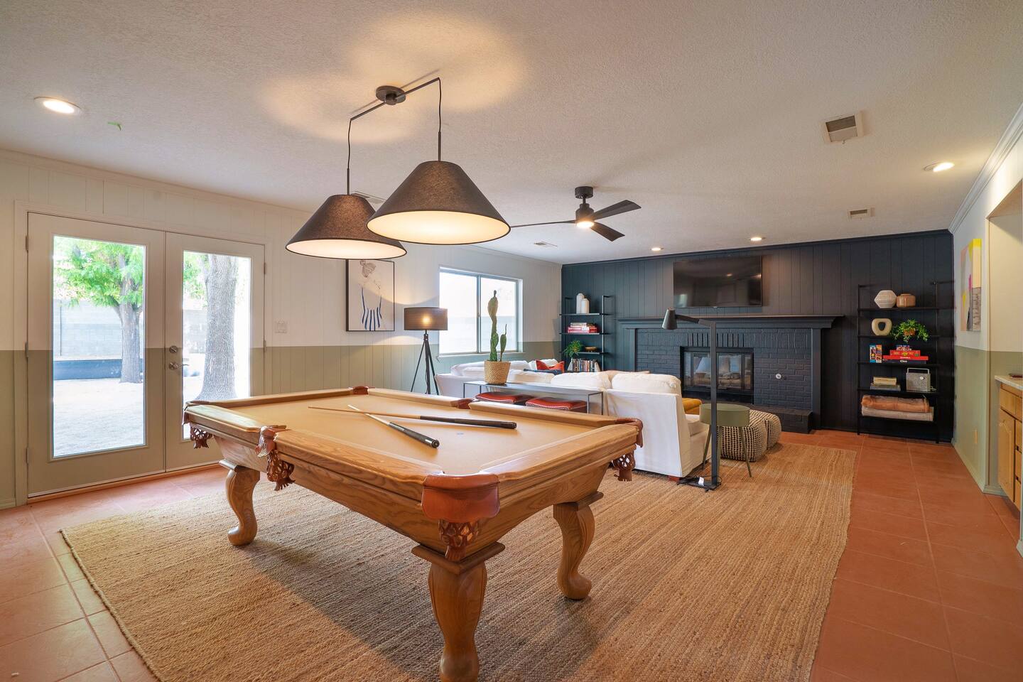 Step into Casa Blanca, a sophisticated 5-bedroom, 3.5-bathroom home spread over 3,550 sq ft on a split-level layout, offering both comfort and elegance. Our home boasts a plethora of amenities for a perfect stay: ➤ Year-round heated pool + hot tub ➤ Outdoor fire pit and BBQ area ➤ Multiple living areas with stylish décor ➤ Free high-speed WiFi ➤ State-of-the-art kitchen appliances ➤ Dedicated workspace ➤ Game room with pool table & ping pong table ➤ Private parking for multiple cars ➤ Air conditioning and ceiling fans in every room ➤ Self-check-in ➤ Pet-friendly, with a fully-fenced back yard ➤ Kid-friendly, with kids books and toys, a kids table, and play kitchen set We also have optional add-ones for an additional fee: ➤Early Check-in, $50 (depending on availability of cleaning crew) ➤Late Check-out $50 (depending on availability of cleaning crew) ➤Blow-up large out door projector screen for epic movie nights under the stars! $50 The highlight of our home is the private, heated pool and hot tub: ➤ Open all year, perfect for any season ➤ Outdoor living and dining area for relaxation or entertaining ➤ Fire pit for cozy evenings ➤Large sand pit with kids toys We ensure you have everything you need for a luxurious outdoor living experience: ➤ Full outdoor kitchen with BBQ grill ➤ Comfortable seating for large groups ➤ Beautifully landscaped gardens ➤ Light-up corn hole, giant Jenga, and giant connect 4 Sleeping Arrangements: Indulge in the ultimate comfort in our well-appointed bedrooms. All bedrooms include Helix Hybrid mattresses, ceiling fans, and USB charging ports. ➤ Master Suite: King bed with plush linens, ensuite with double vanity, private balcony ➤ Bedroom 2: King bed, stylish décor ➤ Bedroom 3: Two twin beds, ideal for children or singles ➤ Bedrooms 4 & 5: Queen and king beds, beautifully furnished for a restful night's sleep All bathrooms include adjustable rain shower heads, hand-held shower wands, body wash, shampoo, conditioner, lotion, feminine hygiene products, and tissues. Living & Dining Room: As you enter through the front door you enter into the main level and a fun yet stylish formal living room with three full-sized sofas perfect for long conversations, catching up, or group meetings. Across from the front door and next to the living room is the Formal Dining room with seating for 10. Kitchen: Enjoy gourmet meals prepared in the chef’s kitchen equipped with modern appliances, including: ➤ Double oven, microwave, dishwasher, and large refrigerator ➤ Coffee station with complimentary supplies ➤ All essential cookware and high-quality kitchen utensils ➤ A wine or beverage fridge The kitchen has a breakfast table that can seat 4 and counter seating for 4 as well. There is also access to the backyard and pool through a slider door. Powder, Laundry & Workout Rooms: Down the hallway from the kitchen is a powder room to the left and a workout room/laundry room at the end. The workout room includes a wall of mirrors & several yoga mats perfect for a group session, as well as free weights, resistant bands, and kettlebells. The space is shared with two sets of washers and dryers. Luxurious Den Room: Down the stairs you are welcomed into the cozy Den space, complete with 7ft pool table, wet bar, and a sectional sofa facing the gas fireplace, complete with a wall-mounted flat screen TV. In this room you will find books, board games, and all the tools necessary to make your favorite cocktail. Behind the pool table is access to the backyard through beautiful French doors. Nearby Attractions: Your stay puts you in the perfect spot to explore Albuquerque and its surroundings: ➤ Vibrant downtown Albuquerque (10 minute drive) ➤ Sandia Mountains for hiking and skiing (5 minute drive) ➤ Albuquerque International Sunport (15 minute drive) Whether you’re looking for adventure or relaxation, our location offers easy access to the best attractions. Glowing Reviews From Guests Like You: "This was one of the best Airbnbs we've ever stayed in. It was super perfect just as described in the listing. Host Tiffany was amazing, very responsive, and clear communication. She understood our travel needs and made the necessary arrangements for our family group of 8. It's a beautiful home and well-organized. The location is very convenient and close proximity to all grocery and restaurant needs. Highly recommend this place if anyone traveling to Albuquerque" -Srikanth "I loved this house so much!! The decor was on point and I really felt like I could just live here forever. There was a lot of cool stuff for my 4-year-old son to do. Every space in the house was usable and so cozy! When we come back to the area we will be staying here for sure and hopefully, it will be in the summer so we can enjoy the pool. Thank you Tiffany!" -Desiree Book Your Stay Today! Ready for a luxurious escape in Albuquerque? Book our home today for an unforgettable experience. If you have any questions, don't hesitate to reach out through our Airbnb messaging. We're committed to making your stay as comfortable and enjoyable as possible. ALL GUESTS ARE REQUIRED TO SIGN A RENTAL AGREEMENT UPON BOOKING. Thank you, Your Host Tiffany
